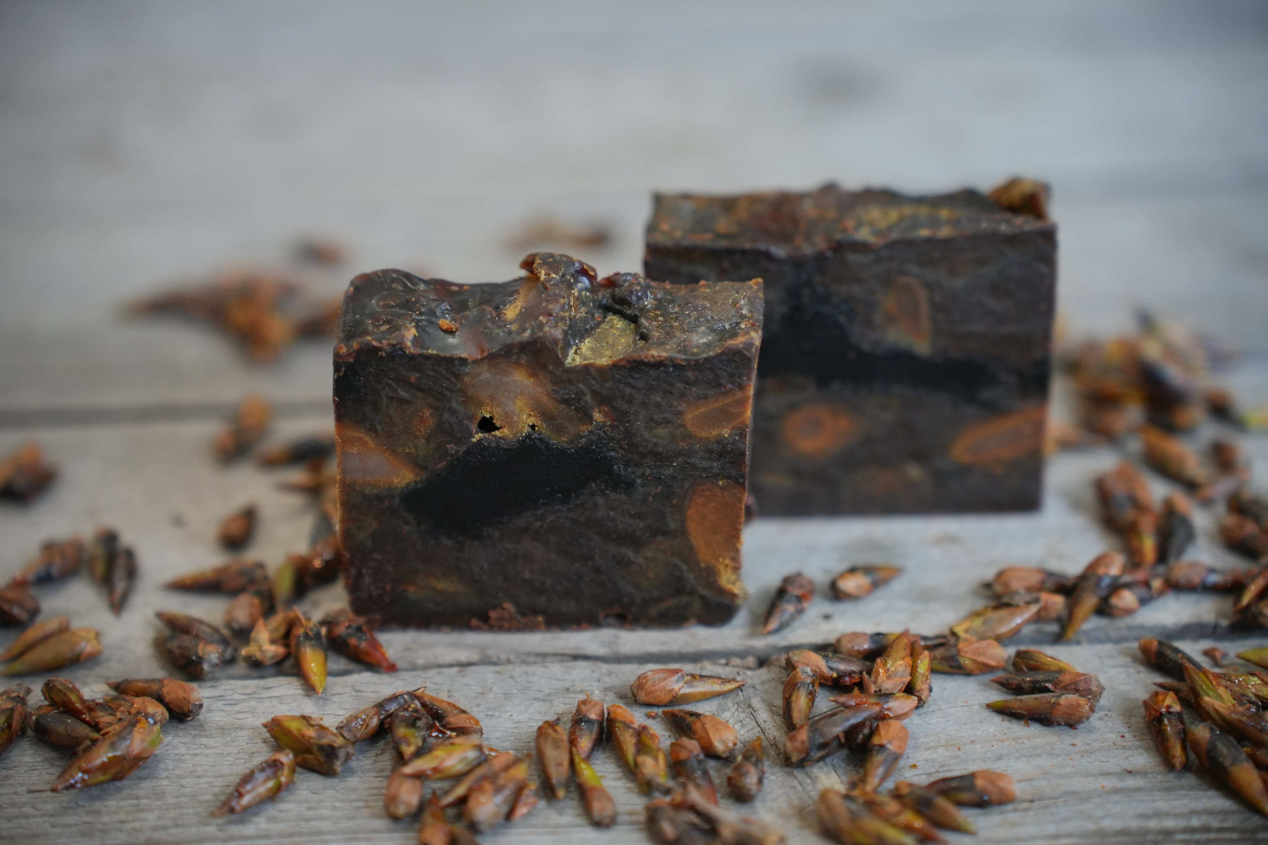 Натуральное мыло, сваренное с нуля из масел и щелочи на масляных инфузах, гидролате и настойке черемухового цвета.